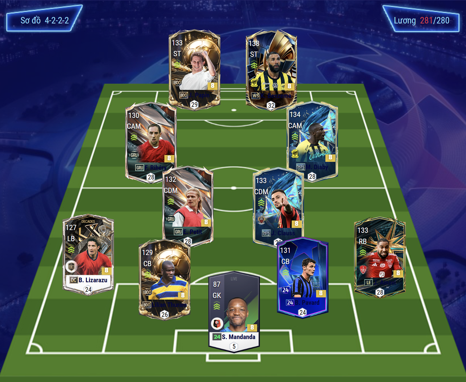 Sơ đồ 4222 được lựa chọn với Papin và Benzema ở trên hàng công cho vị trí tiền đạo. Cả 2 cầu thủ này đều có khả năng di chuyển thông minh, dứt điểm đa dạng bằng cả 2 chân cùng AI phối hợp bóng tốt. Cặp tiền vệ công Ribery và Diaby là những cái tên sở hữu tốc độ, khả năng dứt điểm, sút bóng hiệu quả cùng bộ kỹ năng xâm nhập xuyên phá tốt.