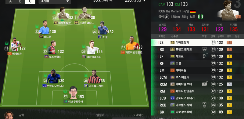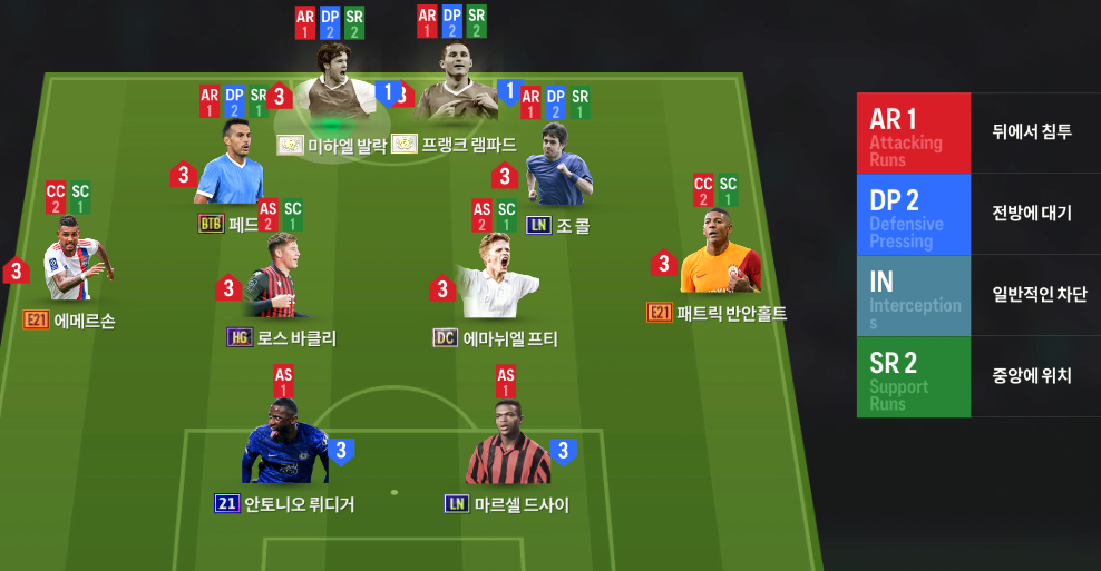 Đội hình được sử dụng là team color Chelsea cùng sơ đồ chiến thuật 2-4-4. Ở sơ đồ này, các vị trí tấn công sẽ rất đông và được kéo cao lên phía trên. Bộ đôi chơi cao nhất trên hàng công là Ballack và Lampard ITM. Cặp hộ công LF, RF được tin dùng là 2 cái tên chạy cánh quốc dân Pedro và J. Cole.