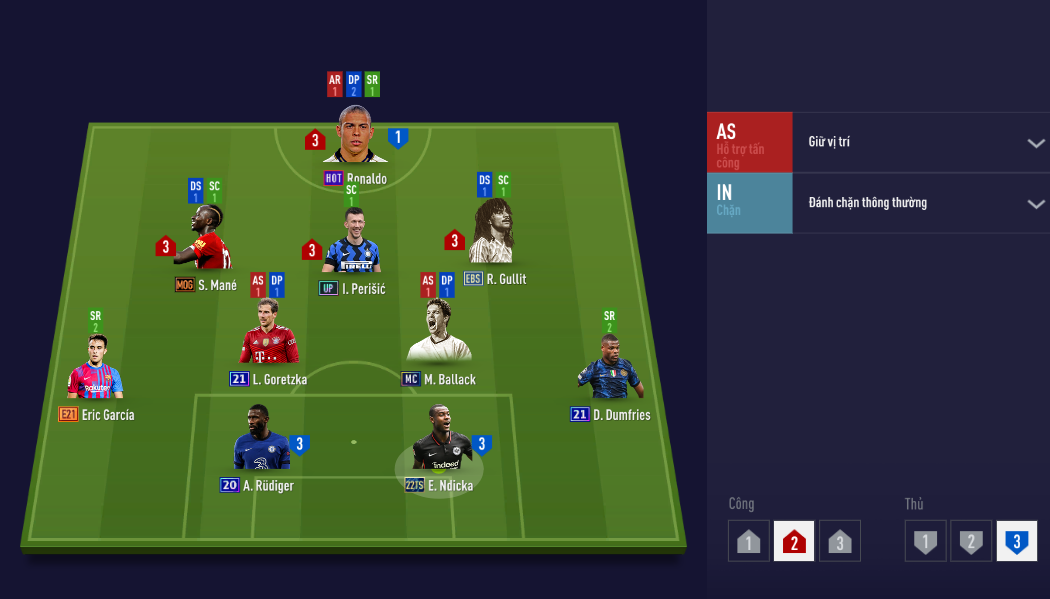 Hai cầu thủ LAM RAM cũng được thiết lập hộ trợ phòn ngự, nhưng xu hướng thủ chỉ để 2, tức là họ chỉ lùi về đến hàng phòng ngự đứng ngang hàng các CDM là hết cỡ. Lúc đó sơ đồ phòng ngự của bạn sẽ được tạo thành bởi 2 lớp khá chắc chắn.