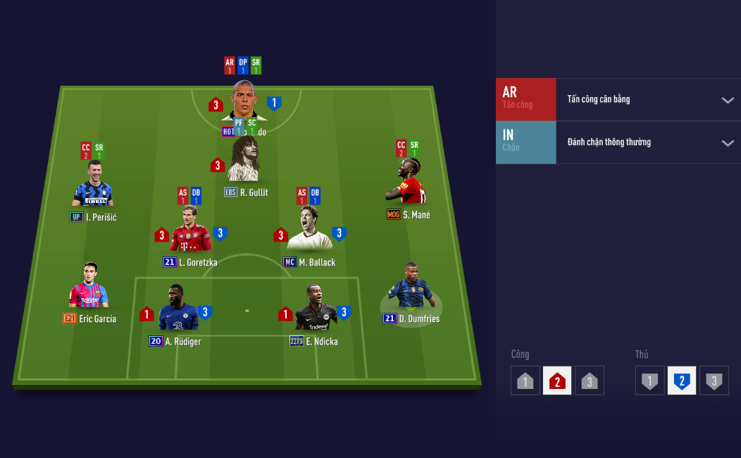 Bên trong có Perisic, Mane tuy không phải là những cầu thủ chơi đầu tốt, nhưng bạn yên tâm gần như 70% những cú tạt sẽ được cặp đôi này đón và vô lê ngay lập tức thay vì dùng đầu. Ngoài ra bạn có thể thực hiện các cú căng sệt ZA, để tận dụng tốc độ băng vào của Mane.