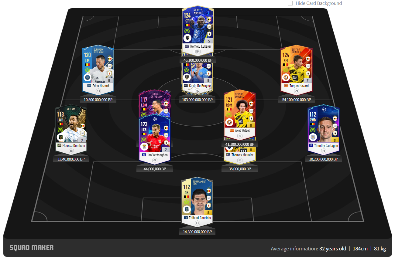 Đội tuyển quốc gia Bỉ có một thế hệ tài năng nhất trong lịch sử của mình. Họ sở hữu những cầu thủ giỏi và là đội tuyển liên tục xếp thứ hạng cao trong bảng xếp hạng của FIFA trong những năm gần đây. Team Bỉ ở trong game cũng là một team mạnh, tuy nhiên lại ít người sử dụng, phần vì lượng fan không đông đảo như các đội tuyển khác.