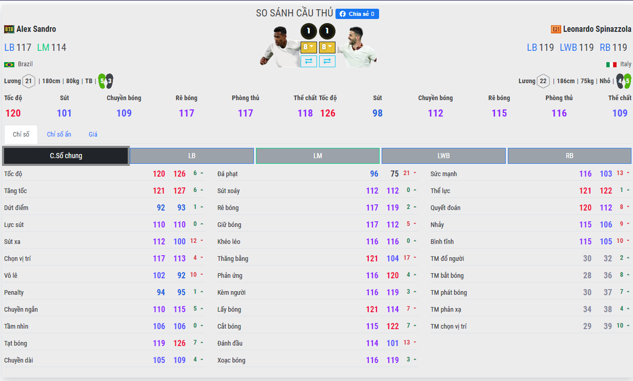 Ở mức thẻ này thì hai cầu thủ có tốc độ cực nhanh, thể hình cũng đủ để chơi ở vị trí trung vệ khi Sandro cao 1m80 còn Spinazzola cao tới 1m86. Đáng chú ý hai chân của hậu vệ người Ý còn đạt 4/5 một ưu điểm rất tốt mà không nhiều trung vệ trong game có được.