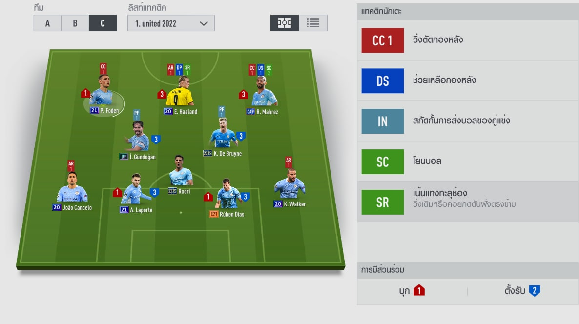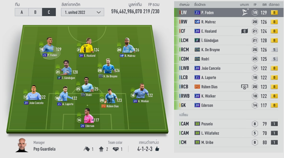 Trong sơ đồ này người chơi cao nhất trên hàng công là Haaland 20UCL. hiện tại Fo4 chưa có thẻ 22UCL nên màu áo có hơi chút lạc lõng, tuy nhiên bạn hoàn toàn có thể sử dụng mùa giải có tính chất cao cấp hơn là 22TS, HLV của Thái sử dụng 20UCL vì anh ta sử dụng mức thẻ +8.