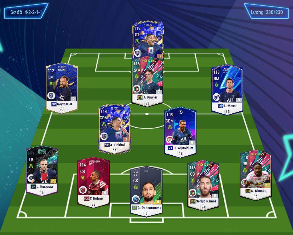 PSG hiện tại có lực lượng cầu thủ khá dày trong FIFA Online 4, điều này cho phép bạn thoải mái xây dựng đội hình và tùy biến lối đá theo nhiều cách khác nhau. Sau khi họ mua về những Ramos, Hakimi, Messi... thì đồng nghĩa với việc trong game team color của PSG sẽ được hưởng các mùa giải tốt nhất của các cầu thủ nổi tiếng trên. Và việc sử dụng họ như nào thì sẽ do các HLV quyết định. Dưới đây là một PSG với 4231 dành cho các game thủ dùng bàn phím