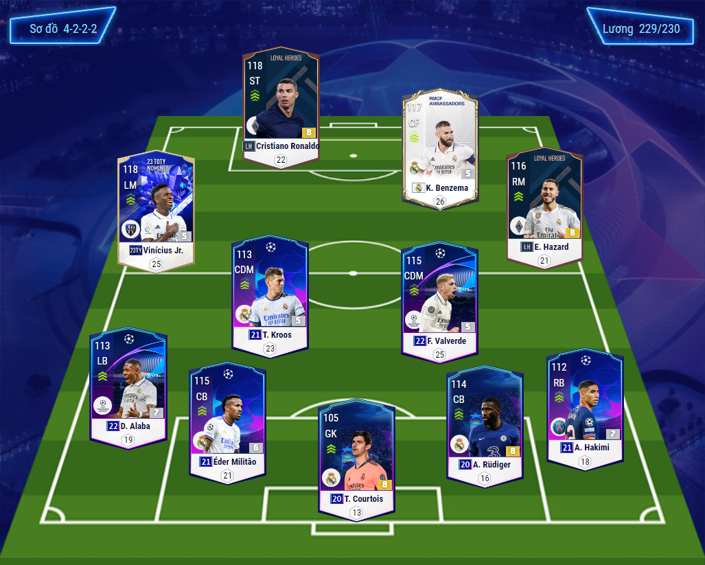 Real Madrid với bộ khung thuộc vào hàng tốt nhất game hiện nay khi bất kỳ vị trí nào trên sân họ cũng có những cầu thủ quốc dân. Với sự bổ sung mạnh mẽ của 22UCL thì giờ đây người chơi càng có thêm những phương án lựa chọn nhờ vào mức ovr khởi điểm của 22UCL Real Madrid khá thấp. Dưới đây là một team Real Madrid với sự bổ sung từ 22UCL chất lượng.