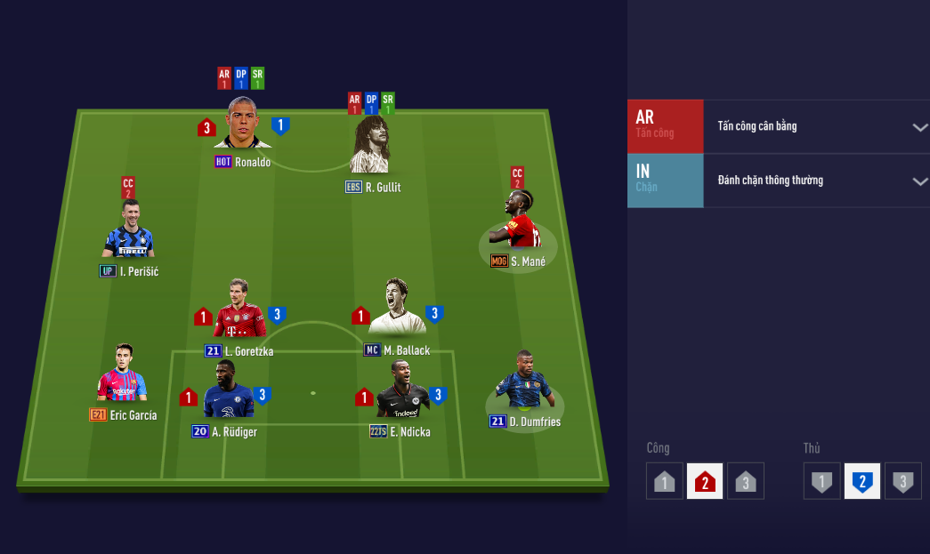 Hàng công là sự kết hợp của cặp đôi Ronaldo LH+8 và Benzema RMA. Ở phiên bản hiện tại Ronaldo LH vẫn là một phiên bản sử dụng ổn khi mà AI của mùa giải này được streamer Bình Be đánh giá là vẫn rất tốt với gameplay của game nhưng phải là mức +8 nhé. Trong khi đó ở tuyến giữa Kroos 21UCL vẫn được đặt trọn niềm tin cùng với phiên bản xịn xò của Valverde 22UCL. Với cặp đôi này thì những pha sút xa của team Real sẽ vô cùng uy lực, trong khi đó yếu tố chuyền chọc vẫn được đảm bảo.