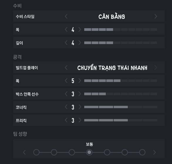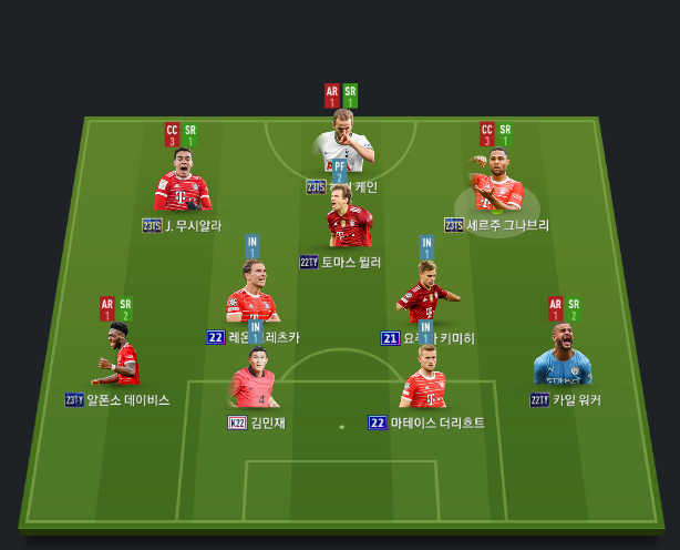 Đây là sơ đồ mà một HLV Hàn Quốc sử dụng, bạn có thể nhận thấy là 4 cầu thủ ở trung lộ là Goretzka, Kimmich, De Ligt, Kim Min Jae đều được thiết lập phòng ngự chủ động, cái này tương đối khác lạ vì rất ít người sử dụng đến thiết lập IN trong game, hay nói đúng hơn là nó đã bị lãng quên. Nhưng với AI hiện nay của các hậu vệ thì nó lại đang là phương án khá hữu hiệu để tăng phần nào phản ứng của các hậu vệ để họ không đứng chôn chân khi mà đối phương chọc khe.