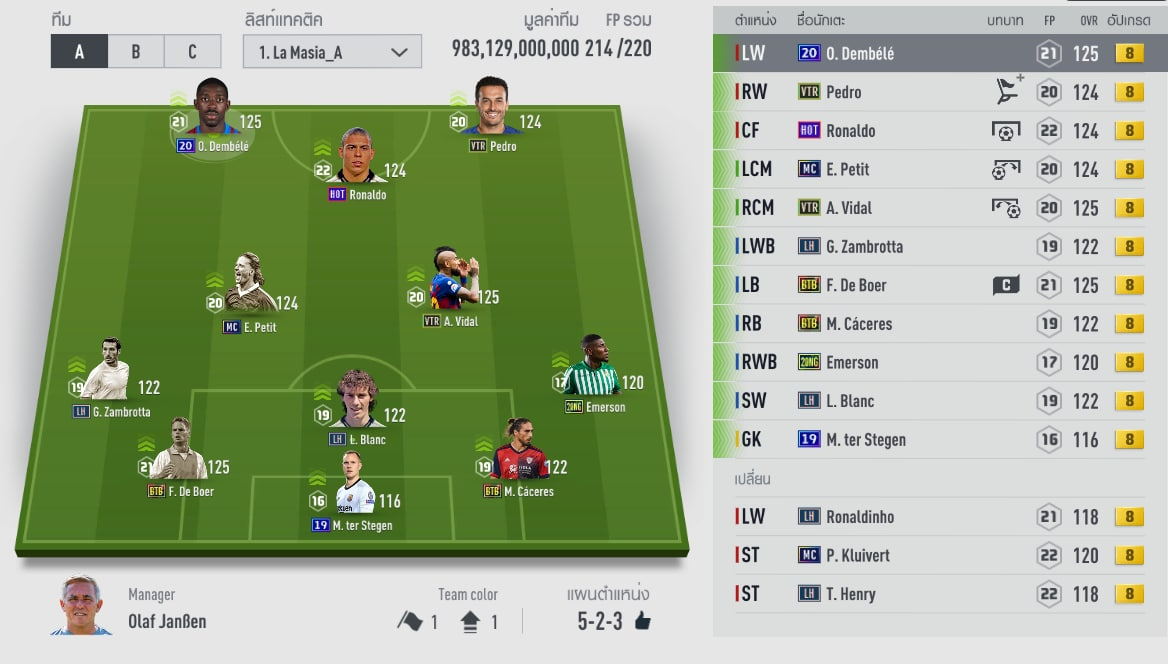 CLB đại diện cho lối đá ban bật ngắn, sử dụng nhiều cầu thủ hạn chế về mặt thể hình nhưng thừa kỹ thuật cá nhân là nguồn cảm hứng cho rất nhiều người chơi FO4, tuy trong rank 1vs1 thì Barcelona có phần hơi đuối thế nhưng GLXH thì Barca đích thực là một CLB không hề đơn giản. Xin được gửi tới các bạn một đội hình Barca cực gắt từ phía HLV Thái Lan