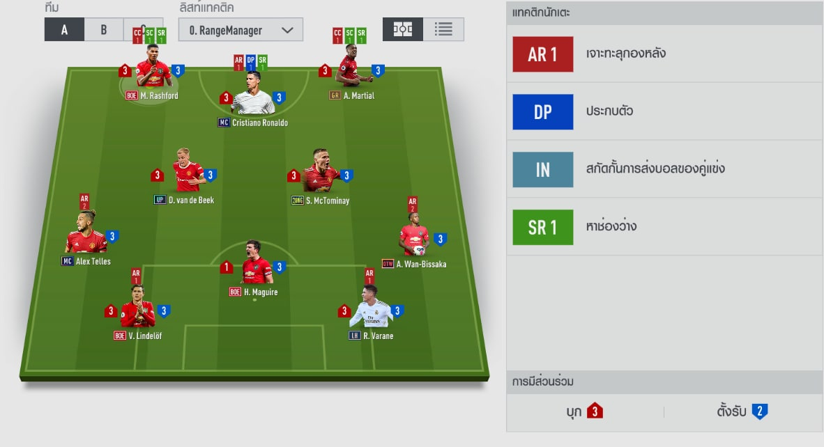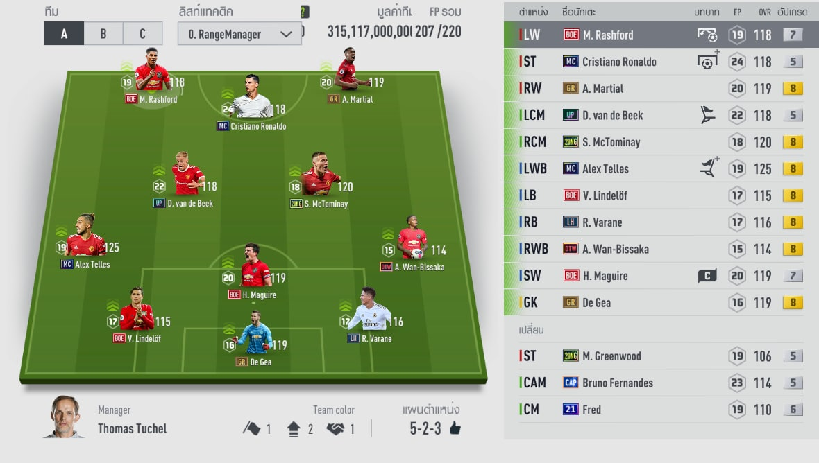Chiến thuật đơn của từng cầu thủ trong team MU. Có điều hơi lạ là nhà quản lý mà HLV này lựa chọn chính là HLV Thomas Tuchel của Chelsea với buff khả năng xâm nhập và tốc độ chạy. Tuy nhiên như các bạn biết thì Tuchel chỉ có hiệu quả với các sơ đồ 4321, 343 và 4123