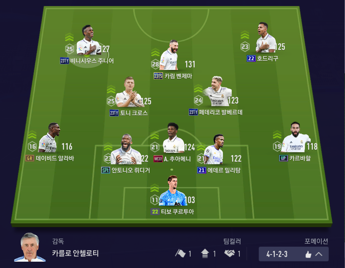 Vẫn là cách bố trí 4123 cơ bản với người chơi thấp nhất ở hàng tiền vệ là Aurelien Tchouameni WC22. Về cơ bản thì cầu thủ người Pháp trong gameplay 9.0 không phải là cái tên nổi bật ở vị trí CDM do tốc độ có phần hạn chế, lại chỉ có hai chân 3/5. Tuy nhiên theo tiêu chí mô phỏng mùa giải 2022-2023 nên chúng ta vẫn tuân thủ theo đúng nguyên tắc đề ra là sử dụng các nhân tố đương đại hiện tại.