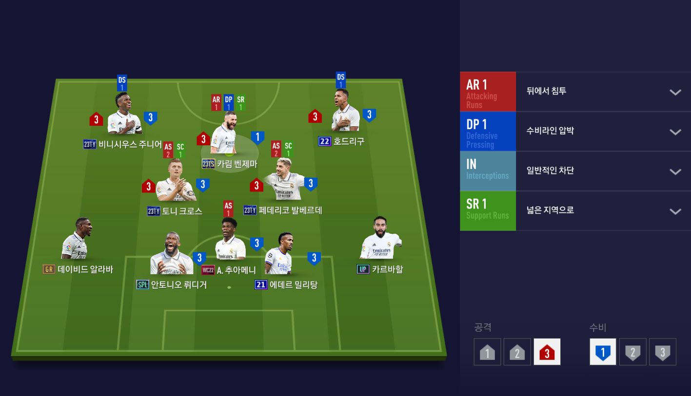 Thiết lập chiến thuật đơn với 4 cầu thủ có xu hướng 3/3 để đội hình phòng thủ luôn có số đông cầu thủ nhất có thể, riêng Benzema thì được mắc màn ở phía trên. Điều này tuy đảm bảo thế trận có phần an toàn nhưng nó lại bào mòn thể lực cầu thủ cực nhanh và bạn cần phải chuẩn bị cho phương án thay thế khi cần. Nhất là hai cầu thủ ở hai bên cánh là Vinicius và Rodrygo.