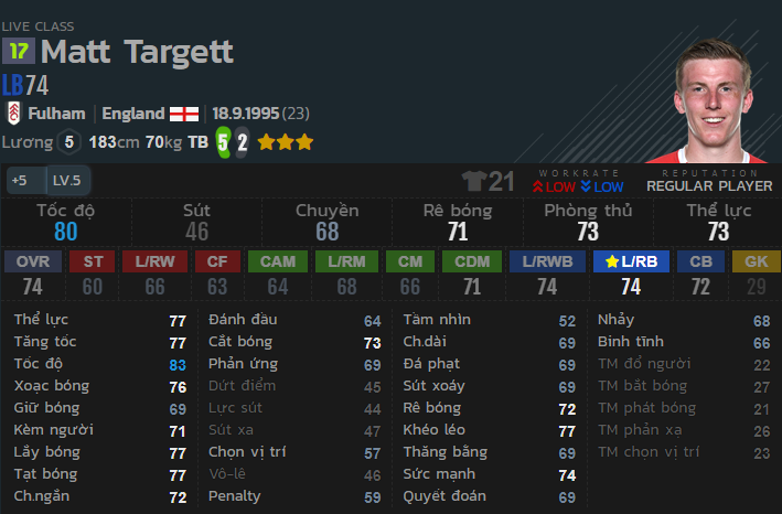 Targett có một tốc độ vừa đủ, khả năng phòng ngự tốt và thường xuyên ở nhà, hạn chế lên tham gia tấn công. Đó là điểm mạnh của thẻ cầu thủ này.