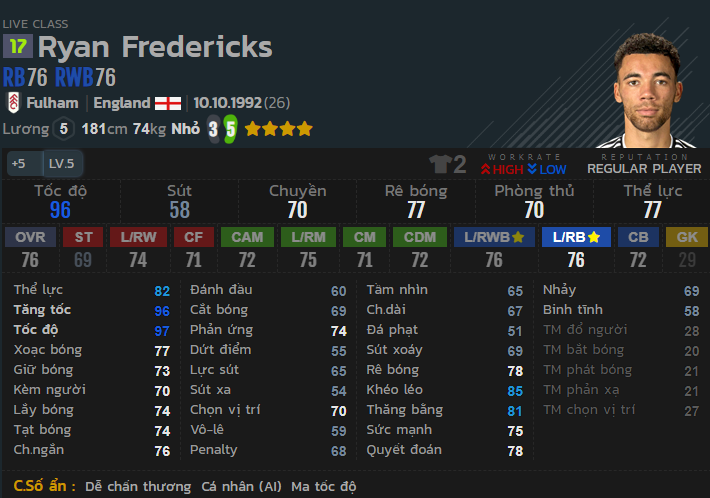 Tốc độ lên tới 96, cực kì nhanh và linh hoạt, khả năng rê bóng tốt và phòng ngự ổn. Fredericks sẽ là cái tên vô cùng khó chịu nơi phòng ngự bên hành lang cánh phải.