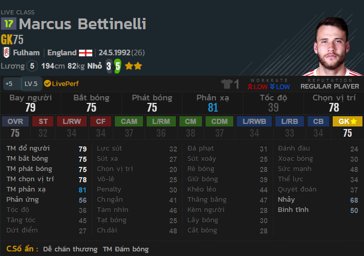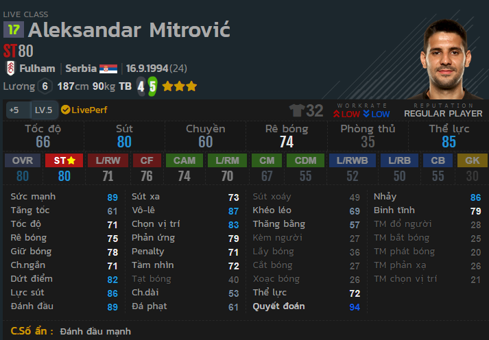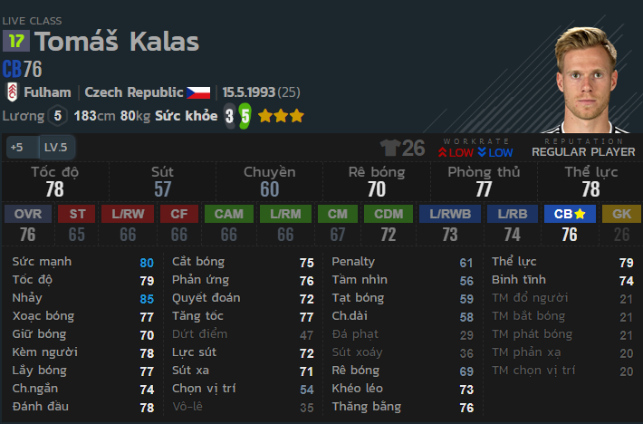 Trung vệ có thể hình to, tốc độ tố lê tới 78, sẵn sàng tì đè đua tốc với các tiền đạo tốc độ cao. Khả năng phòng ngự ở mức ổn định khiến cho cầu thủ này vô cùng khó chịu trên sân.