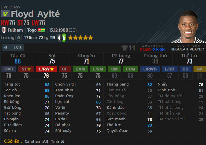 Ayite có tốc độ tăng tốc cực tốt, khả năng bứt tốc nhanh cùng với đó là thăng bằng cũng như khéo léo cao khiến cầu thủ này cực kì khó bị đẩy ngã trong những pha tì đè và rê bóng ngoặt bóng trở nên dẻo hơn rất nhiều. Thể lực dồi dào giúp cầu thủ này công thủ vô cùng linh hoạt. Điểm yếu của cầu thủ này là khả năng tạt bóng hơi kém với một cầu thủ đá cánh. Chỉ thích hợp để tạt bóng cọc gần. Tạt bóng cọc xa bóng đi hơi phập phù.