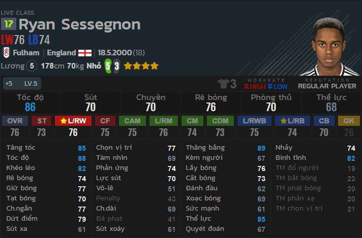 Tiền đạo cánh trẻ sinh năm 2000 của đội tuyển anh là một cầu thủ khá toàn diện ở vị trí hành lang cánh khi có thể thi đấu cả 3 vị trí tiền đạo cánh, tiền vệ cánh và hậu vệ cánh. Tốc độ cao, khéo léo ở mức ổn cùng với 4 sao kỹ thuật khả năng ngoặt bóng, rê bóng của cầu thủ này là khá tốt. Cùng với đó thăng bằng 89 khiến cầu thủ này vô cùng khó bị đẩy ngã. Thể lực 85 giúp Sessegnon lên công về thủ trong suốt 90p mà không sợ đuối thể lực ở cuối trận