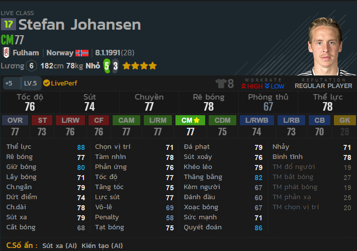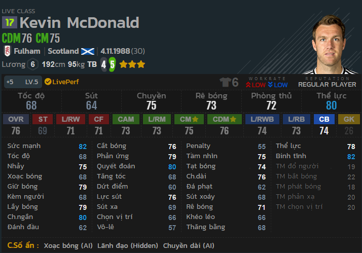 Bộ chỉ số tương đối đồng đều cho vị trí tiền vệ trung tâm, cùng với thể lực 88 và tốc độ ở mức 76 sẽ khiến cầu thủ này bao quát sân tốt. Chuyền bóng rê bóng ở mức tốt 77,78 khiến cho vị trí này vô cùng lợi hại khi tấn công.