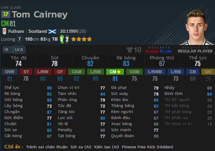 Cairney, nhân tố chủ chốt của clb Fulham trong quá trình thăng hạng. với thể lực 85, chuyền và rê dắt bóng ở mức 82,83 khiến cho cầu thủ này vô cùng dẻo khi xử lý bóng cũng như chuyền bóng. Chỉ số sút tốt và tốc độ ở mức ổn khiến cầu thủ này mạnh trong những pha tấn công và sút xa tầm trung ngoài vòng cấm. Thể hình trung bình, chiều cao lý tưởng và sức mạnh 77 và thăng bằng 83 giúp hoàn thiện khả năng tranh chấp của cầu thủ này ở khu vực giữa sân.