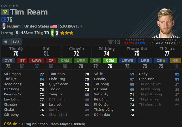 Mặc dù vị trí mặc định của Ream là CB, tuy nhiên với tốc độ tốt, khả năng chuyền bóng, rê bóng và phòng ngự đều ở mức tốt, Ream thích hợp cho vị trí CDM hơn vì bao quát sân tốt hơn. Cùng với cứng như thép và Team player sẽ là 2 chỉ số hỗ trợ tuyệt vời cho vị trí CDM