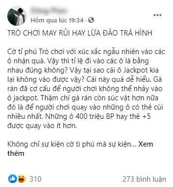 Cờ tỉ phú Trò chơi với xúc xắc ngẫu nhiên vào các ô nhận quà. Vậy thì tỉ lệ đi vào các ô là bằng nhau đúng không? Vậy tại sao cái ô Jackpot kia lại không vào được vậy? Cái này quá dễ hiểu. Gà rán đã cơ cấu để người chơi không thể nhảy vào ô jackpot. Thậm chí gà rán còn súc vật hơn nữa đó là để người chơi quay vào những ô có thẻ cùi nhiều nhất. Những ô 400 triệu BP hay thẻ +5 được quay vào ít hơn.