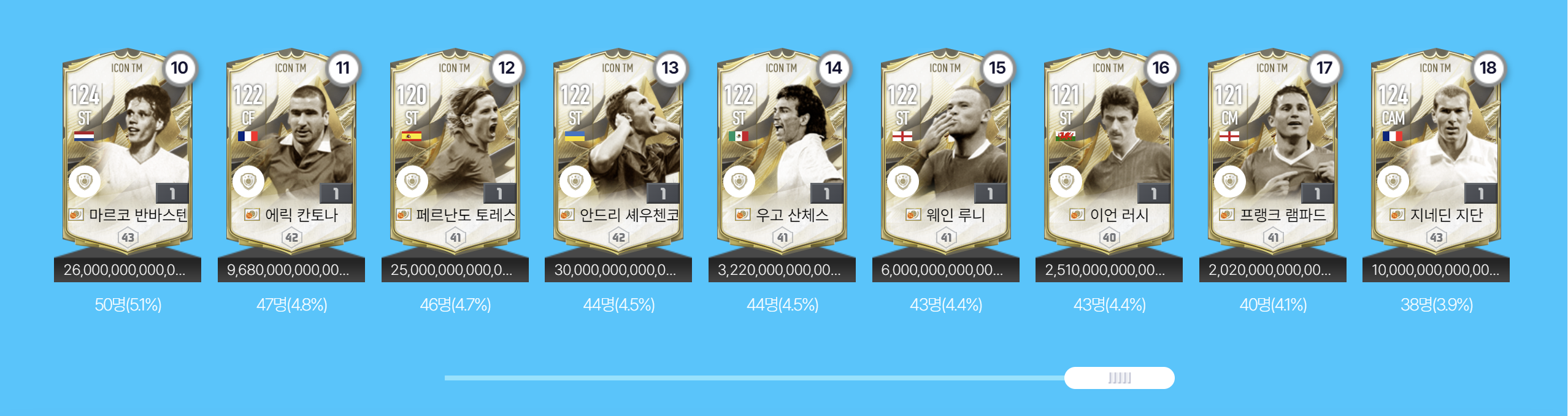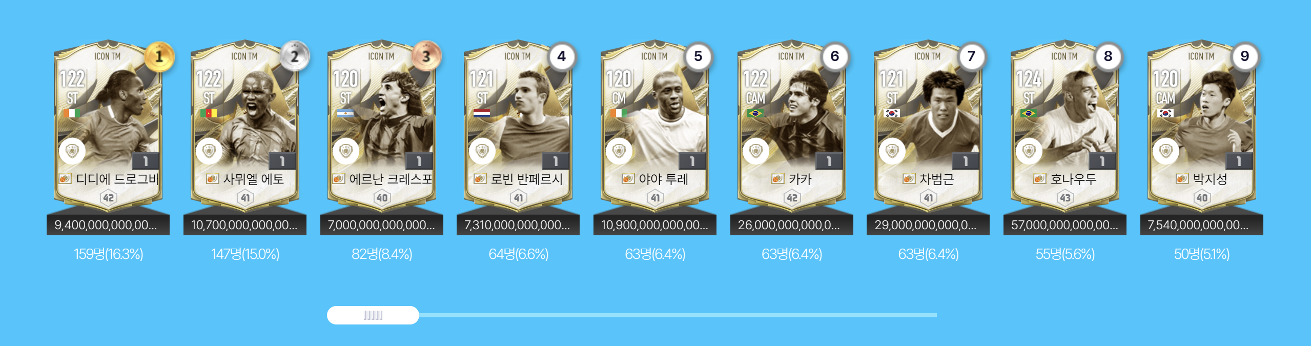 Trong danh sách phía trên ngoài 2 cái tên vốn đã có chỗ đứng là Kaka và Ronaldo de Lima thì Marco Van Basten cũng có một sự trở lại mạnh mẽ ở mùa thẻ ICON TM. Nhiều game thủ Hàn Quốc chia sẻ về sự ấn tượng trong việc ghi bàn với Basten và hiện tại Basten đang có hiệu suất ghi bàn cực cao ở máy chủ Hàn Quốc. Ngoài ra, Shevchenko, Cantona hay Torres cũng là những ICONTM đang có lượng người chơi sử dụng trong thi đấu cực cao.