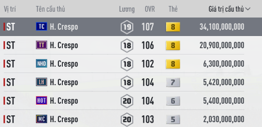 Trên hình là các thẻ mùa giải của Crespo ở mức mà người chơi có thể sở hữu được. Giá ở mức +5 là tương đối phù hợp với các HLV "cày chay". Còn cộng 8 có lẽ đòi hỏi phải nạp thẻ kha khá.