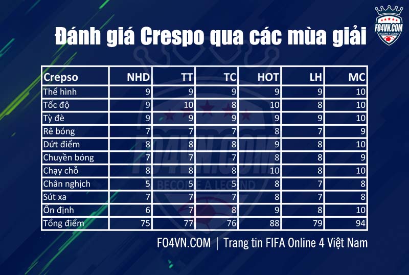Crespo được các HLV đánh giá là tiền đạo ổn định vào hàng top game, qua mọi meta thì anh vẫn luôn nằm trong những sát thủ mà mọi HLV tin dùng. Tuy nhiên lúc này trong FIFA Online 4 đã có quá nhiều thẻ mùa giải. Và mùa nào cũng na ná nhau, vậy Crespo nào mới là mùa giải đem lại sự an tâm nhất cho người sử dụng ( ngoài ICON ). FO4VN xin gửi tới các bạn bài viết đánh giá về các mùa giải của số 9 huyền thoại Argentina tại world cup 2006. Mong giúp các bạn có thể tham khảo trước khi quyết định mua anh về nhà.