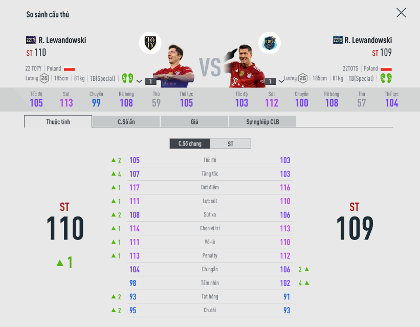 Xét về mặt chỉ số các bạn có thể nhìn thấy rõ ràng là mùa 22TY có Ovr cao hơn và chỉ số thành phần cũng cao hơn