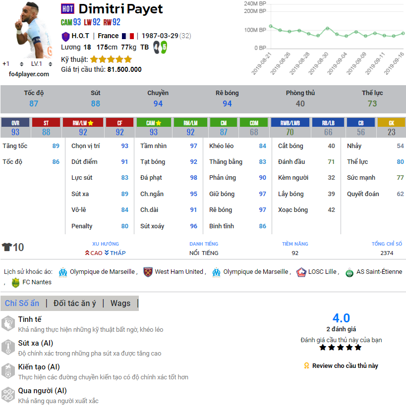 Chỉ số của Payet | Nguồn : FO4PLAYER.COMD.Payet - Đánh giá trong game