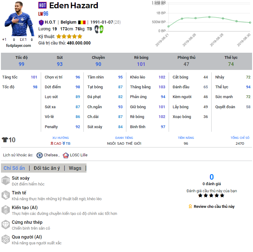 Chỉ số của Eden Hazard | Nguồn : FO4PLAYER.COMChấm điểm : 9,2/10