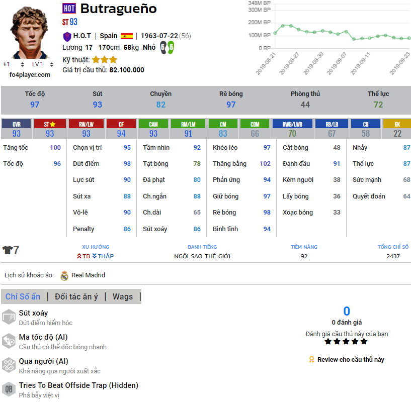 Chỉ số của Butragueno | Nguồn : FO4PLAYER.COMButragueno - Đánh giá trong game