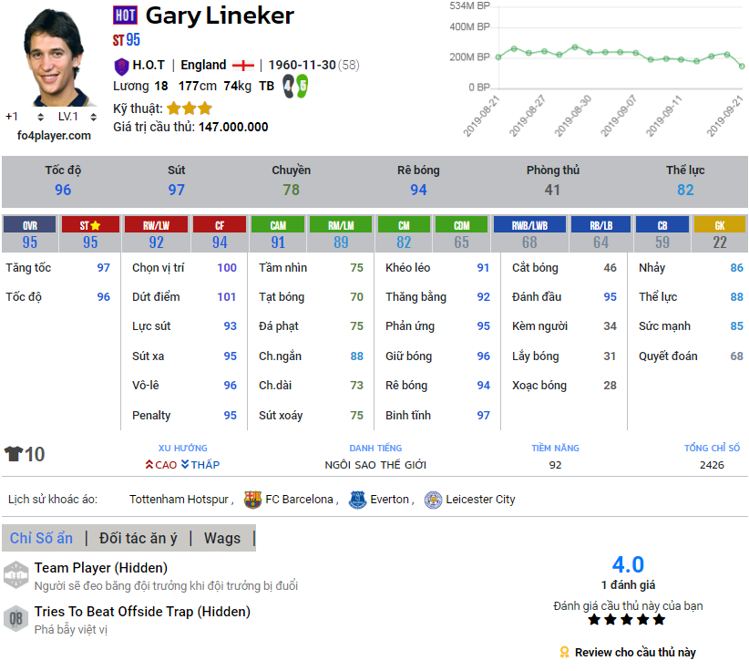 Chỉ số của Lineker | Nguồn : FO4PLAYER.COMG.Lineker - Đánh giá trong game