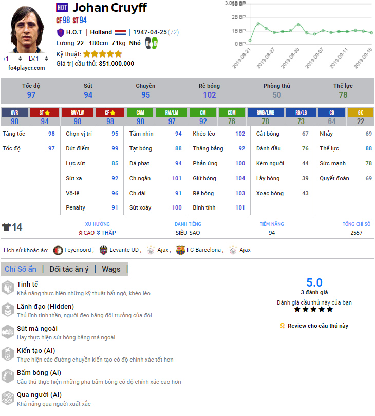 Chỉ số của Cruyff | Nguồn : FO4PLAYER.COMJ.Cruyff - Đánh giá trong game