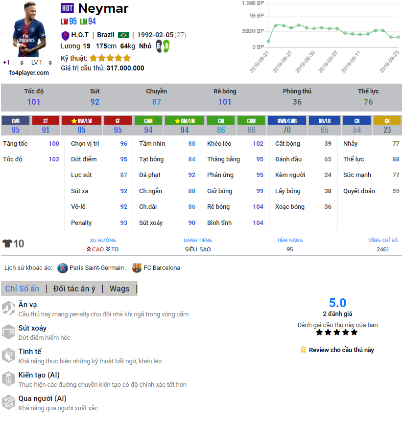 Chỉ số của Neymar | Nguồn : FO4PLAYER.COMNeymar - Đánh giá trong game