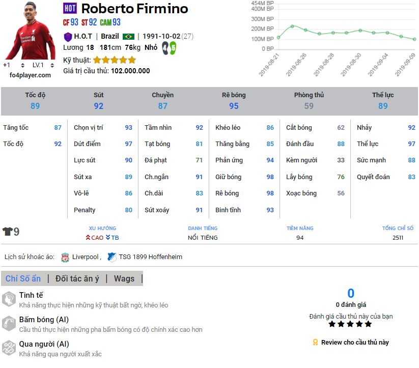 Chỉ số của Firmino | Nguồn : FO4PLAYER.COMRoberto Firmino - Đánh giá trong game