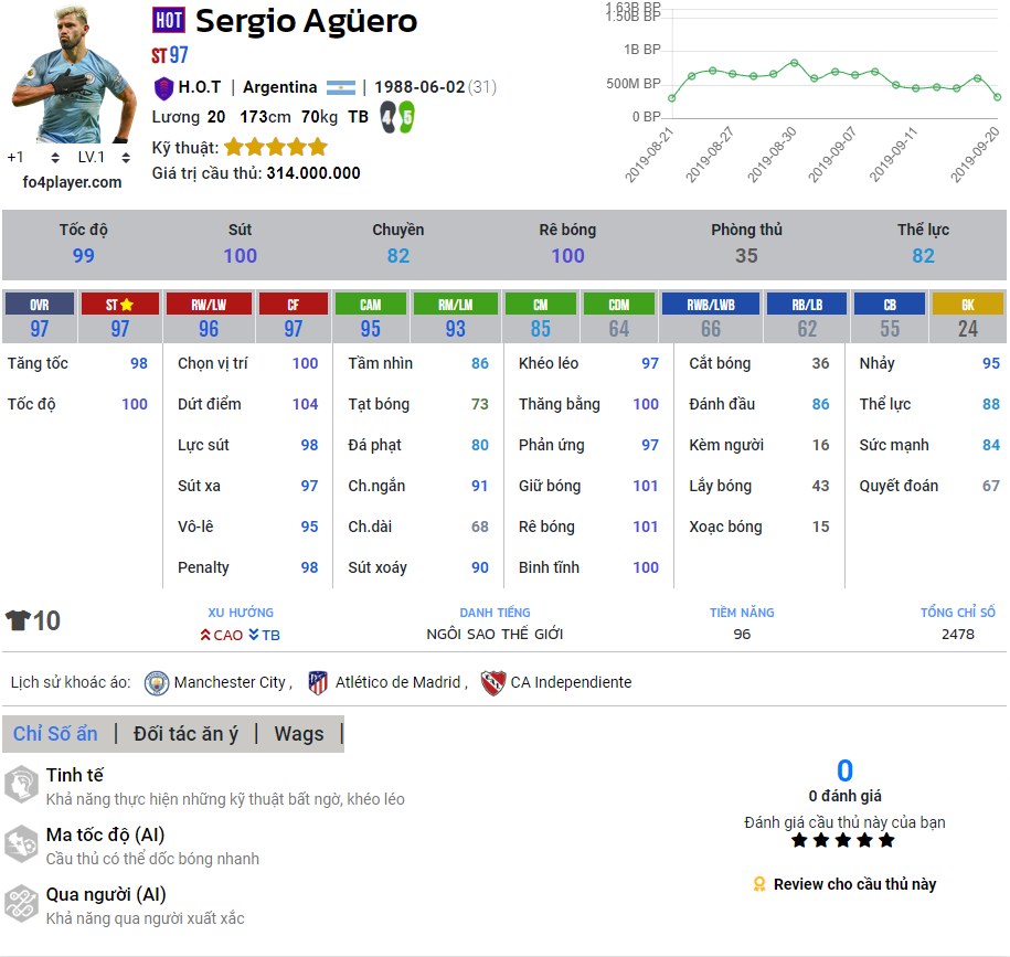 Chỉ số của Aguero | Nguồn : FO4PLAYER.COMS.Aguero - Đánh giá trong game