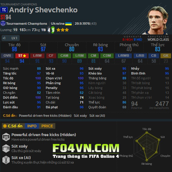 Mùa giải TC mô tả giai đoạn đỉnh cao sự nghiệp của Sheva khi anh cùng Milan giành chức vô địch C1. Vậy Shevchenko TC có những ưu điểm nào, hãy cùng FO4VN.COM tìm hiểu trong bài viết dưới đây.