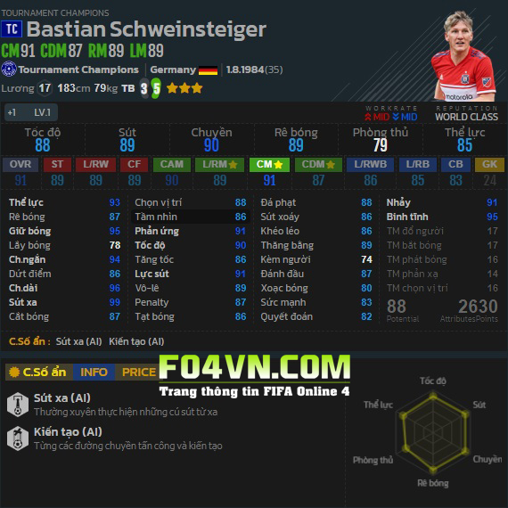 Vị trí sở trường là tiền vệ trung tâm CM với chỉ số lên tới 91. Lương của Schweinsteiger là 17..
