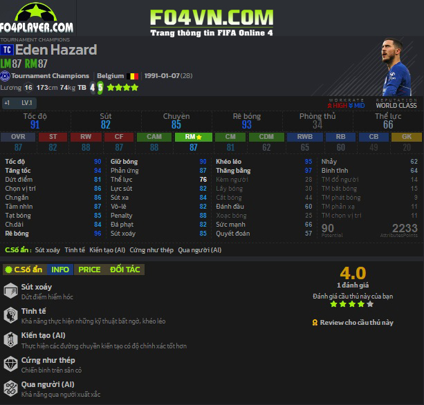- Chuyền bóng : Hazard chuyền bóng ngắn lẫn dài đều rất tốt. Khả năng tạt bóng của Hazard là tốt khi bóng đi có độ xoáy và điểm rơi chính xác.