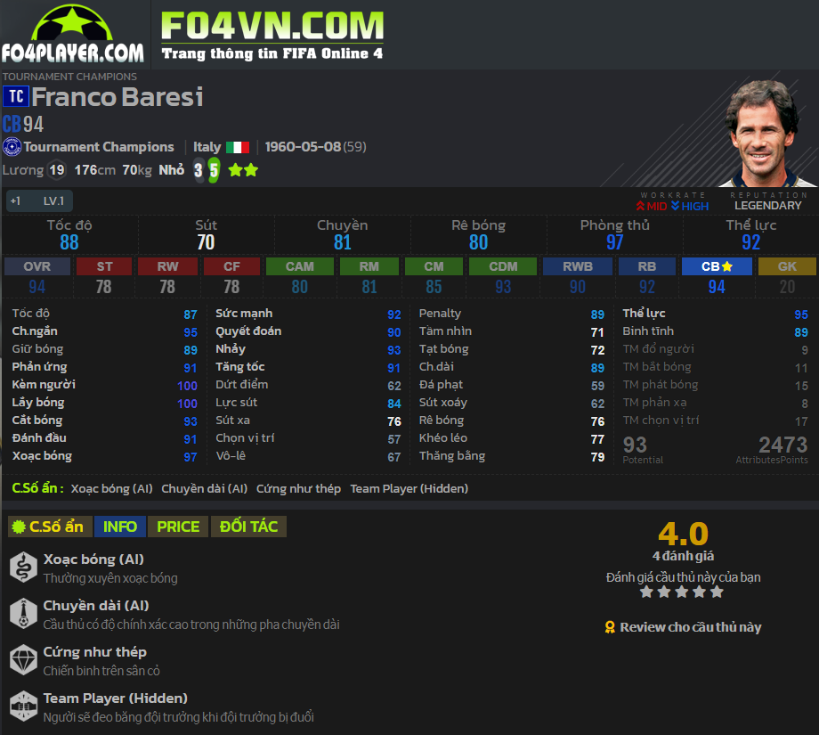 - Lương : Lương 19 của Baresi là rất cao trong khi đó, hiệu quả phòng ngự của Gameplay hiện tại là không cao và đôi khi hơi khó dùng đối với một số game thủ .