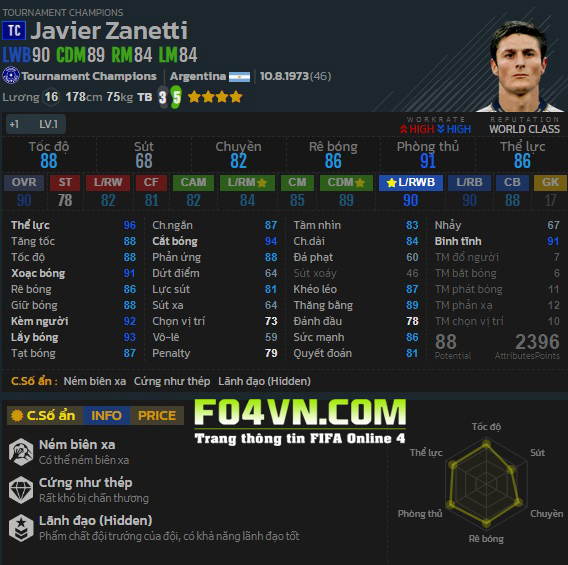 - Rê bóng : Điểm thú vị của Zanetti đó là anh có tới 4 sao kỹ thuật cùng với đó là chỉ số rê bóng ở mức cao. Trong game, cảm giác Zanetti rê bóng, ngoặt bóng hay đảo bóng đều rất mượt và khéo léo.