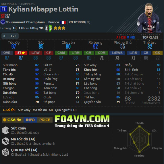 Mùa giải TC mô tả Mbappe trong quá trình chinh chiến C1 cùng clb PSG. Tuy nhiên, anh chưa thực sự tạo nên dấu ấn ở giải đấu này lắm. Vậy Mbappe TC có những điểm nổi bật nào? Hãy cùng FO4VN.COM tìm hiểu ở bài viết dưới đây.