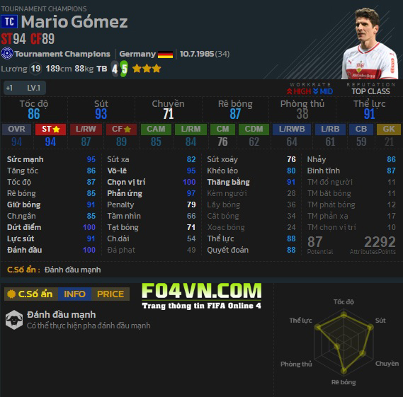 - Không chiến : Khả năng đánh đầu rất tốt với độ chính xác cao và lực đánh đầu rất mạnh. Đặc biệt là khả năng di chuyển chọn vị trí đón bóng của Gomez là rất tốt.