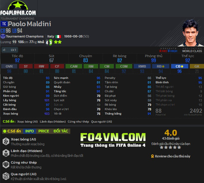 - Tốc độ : Tốc độ của Maldini được cải thiện một cách đáng kể so với mùa giải NHD. Maldini giờ nhanh hơn, áp sát tốc độ cao hơn, bám đuổi rát hơn và là cơn ác mộng cho các cầu thủ tấn công đội bạn.