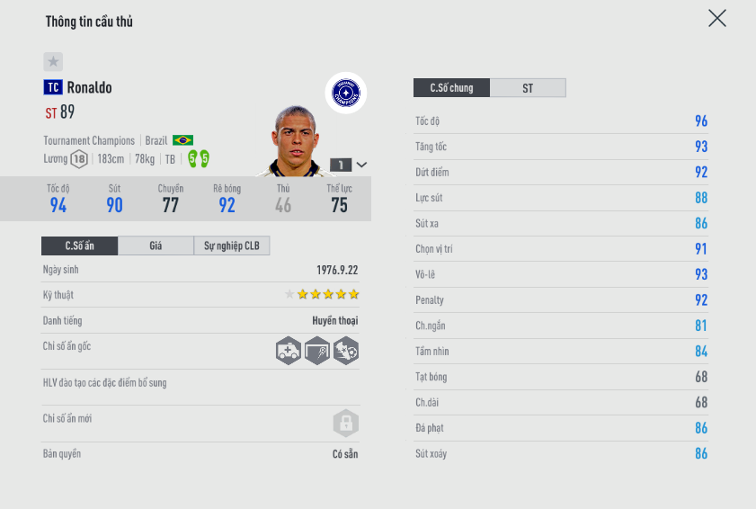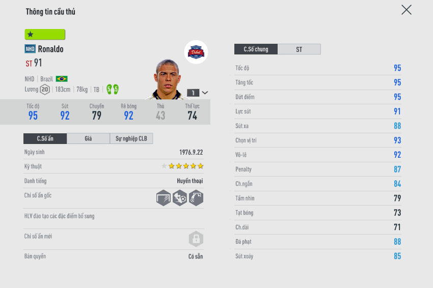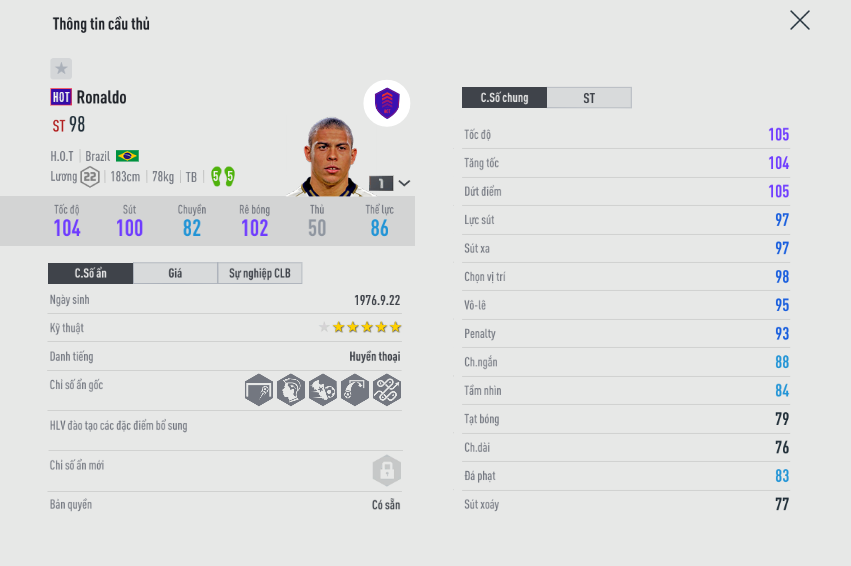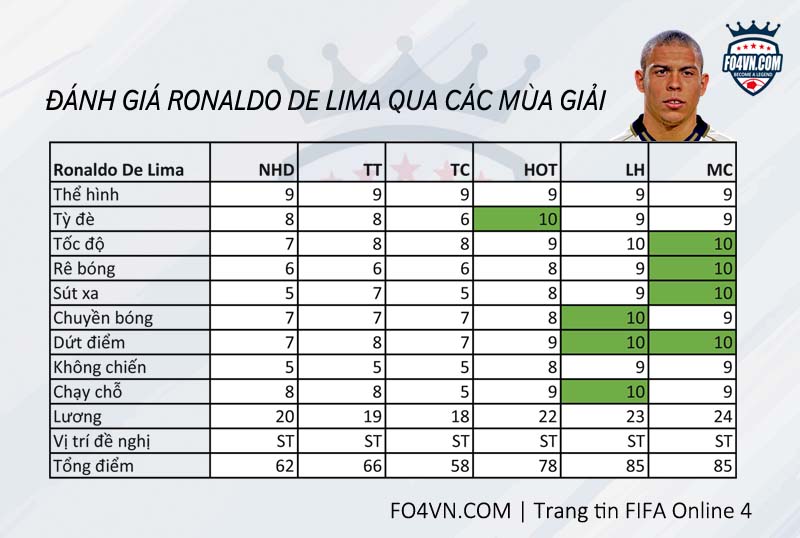Siêu tiền đạo Ronaldo là cái tên mà bất cứ HLV nào cũng muốn sở hữu, bởi sự toàn diện trong lối chơi, và cực kỳ dễ làm chủ. Từ chuyên nghiệp cho đến thách đấu, đâu đâu bạn cũng có thể thấy sự xuất hiện của tiền đạo người Brazin. Tuy nhiên tùy vào tài chính mỗi người có lựa chọn khác nhau. Vậy sự khác nhau giữa các mùa giải của Ronaldo De Lima ở đâu. Chúng ta sẽ cùng đánh giá.