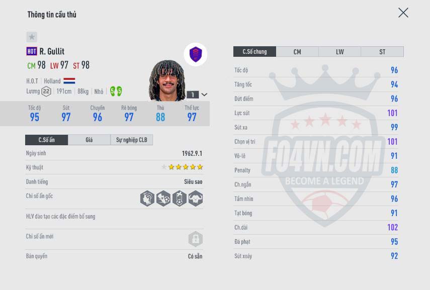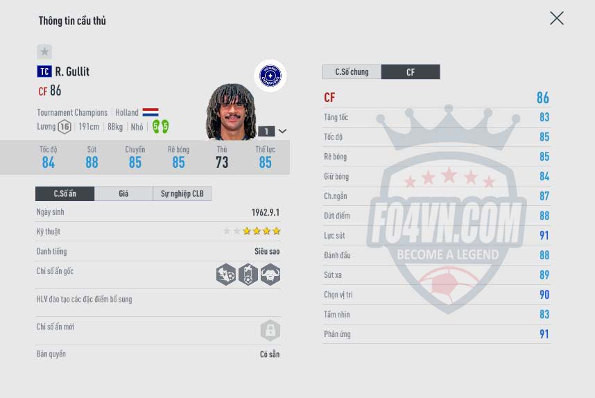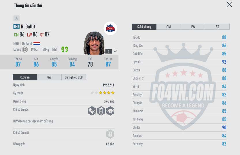 Vị thần sức mạnh trong game khi có thể chơi bất kỳ vị trí nào trừ thủ môn. Gullit là cái tên gần như không thể thiếu trong đội hình rất rất nhiều các HLV FO4. Giá luôn vào hàng top khi mùa giải mới ra mắt mà có mặt anh. Thể hình cao lớn, tốc độ nhanh, tỳ đè khỏe, khả năng không chiến top game, Sút xa bá đạo. Đó là những gì mà có lẽ còn hơi ít khi nhắc đến cái tên huyền thoại của Chelsea và Ac Milan.