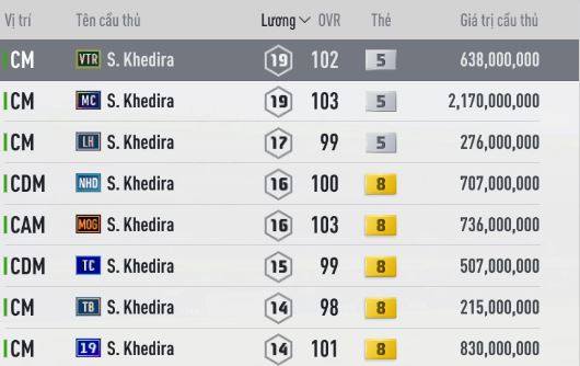 Trả lại một CDM đúng nghĩa cho Khedira, cao to, khỏe , tốc độ đủ dùng, đặc biệt lao vào áp sát thì cực mạnh, gần như tông húc đối phương bật ra ngay để cướp bóng. AI chọn vị trí cũng như bọc lót cũng được nâng cấp hơn hẳn. Luôn có mặt ở điểm nóng phòng ngự. Không chiến chắc chắn. Điểm trừ duy nhất có lẽ là chuyền bóng và phát động tấn công hơi thiếu ổn định. Nhưng lương khá là thấp với con số 17. Hiệu năng phòng ngự đem lại là khá hời với mức lương này