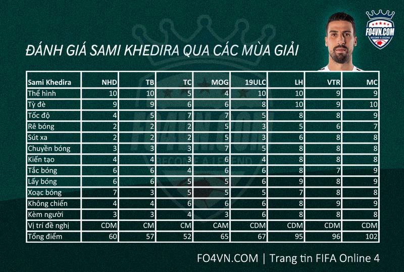 Cựu tiền vệ của Real Madrid và Stuttgart có thể hình có thể nói là tuyệt vời cho FIFA Online 4. Tuy nhiên không phải cứ cao to là yếu tố quyết định được mọi việc. Trước hết chúng ta sẽ điểm qua các mùa giải của Khedira trên TTCN