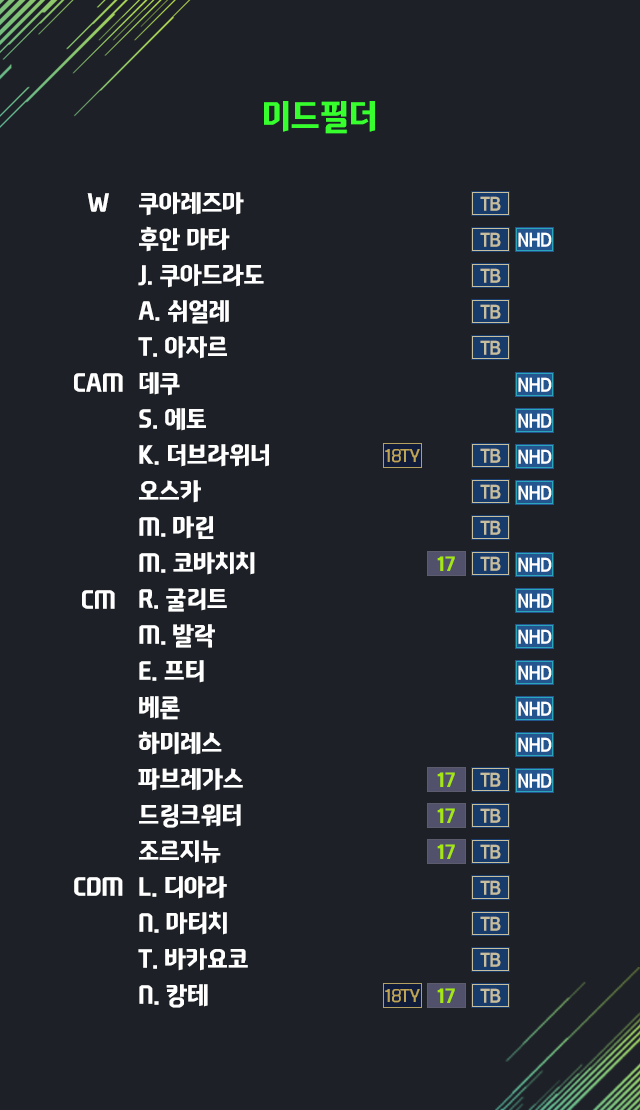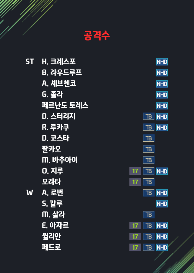 Tiền đạo ST H.Crespo B.Laudrup A.Shevchenko G.Zola Fernando Torres D.Sturridge R.Lukaku D.Costa Falcao M.Batshuayi O.Giroud Morata LW,RW A.Robben S.Kalou M.Salah E.Hazard Willian Pedro