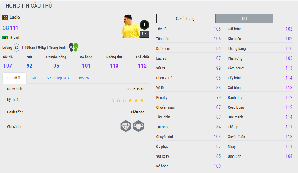 Trung vệ người Brazil và từng vô địch C1 trong màu áo của Inter Milan năm 2010 là một cầu thủ đã ra mắt khá lâu, tuy nhiên tiếng vang mà Lucio đem lại trong FC Online chưa thực sự ấn tượng. Sau thời gian đầu được chú ý với danh tiếng từ FO3 đem lại, số lượng người sử dụng Lucio là rất ít. Giờ đây mùa giải Century Club sẽ là một cơ hội để đưa trung vệ cao lớn này thực sự gia nhập hàng ngũ những trung vệ tốt nhất của game. Với khả năng cắt bóng, chống bóng bổng cực hay và tất nhiên khoản tỳ đè miễn chê.